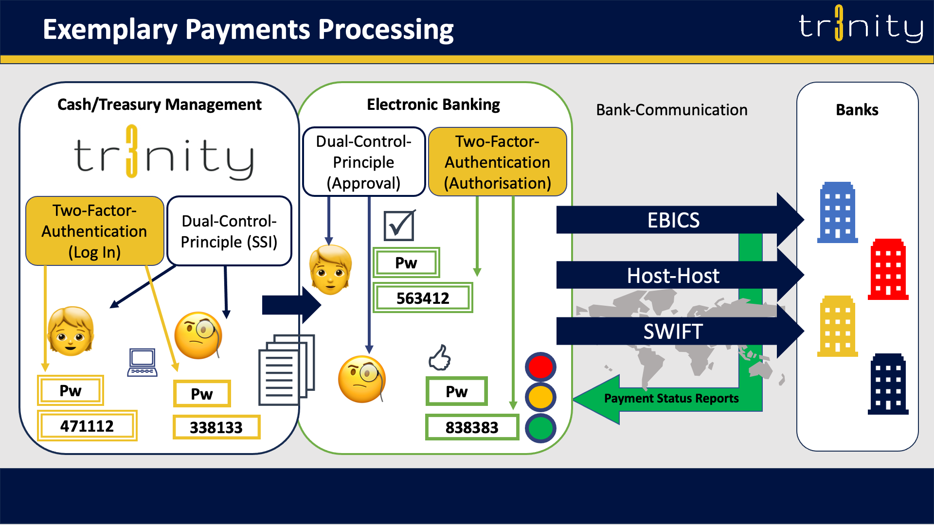 While the operational payments generally originate in the company's accounting, Trinity TMS generates transfers from cash management or treasury only. The entirety of the payment flows as the basis for the cash forecast is found in the treasury system anyway; effective payments arise in Trinity TMS as a result of daily planning or in isolated cases from financial transactions. The route and file format of such payments is defined by the creation of so-called standing settlement instructions (SSI) in accordance with the dual control principle in order to eliminate attempts at fraud.